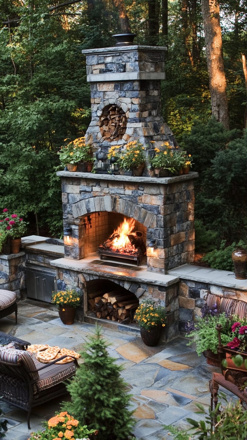 Enchanting Outdoor Oasis with a Cozy Fireplace