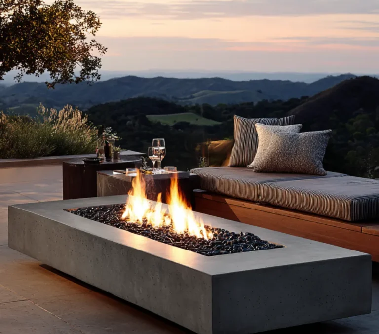 Embrace evenings outdoors with a sleek fire pit that elevates your modern patio experience 🔥🪑✨. The architectural fire pit, crafted from smooth dark gray concrete, not only adds a contemporary aesthetic but also serves as a functional table for gatherings. Enjoy the warm fire glow while integrated lighting enhances the ambiance, making it a perfect spot for relaxation. Explore stylish outdoor living ideas with this unique focal point that embodies the best of a luxury fire pit.